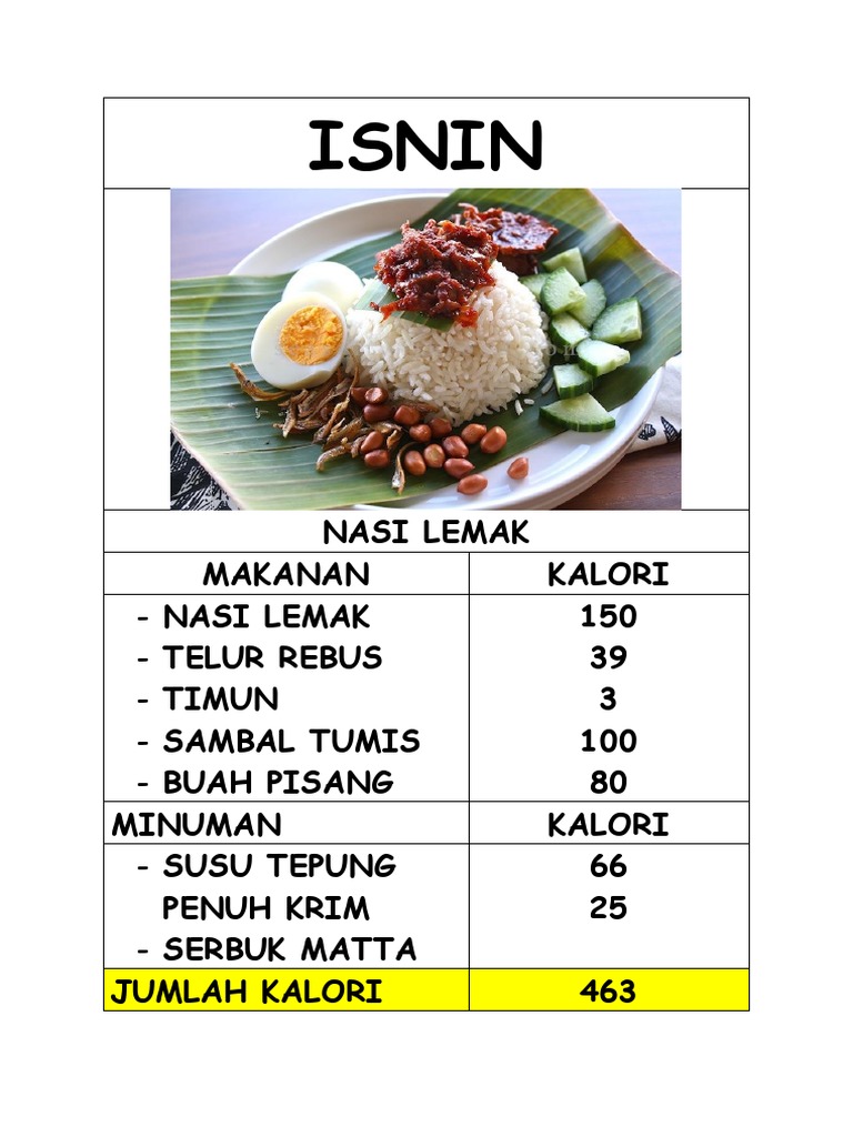 Hitung nilai kalori Makanan pagi jam 0700 WIB dengan menu. Kandungan Kalori Nasi Lemak. Terdapat 320 kalori dalam 1 bungkus 72 g.